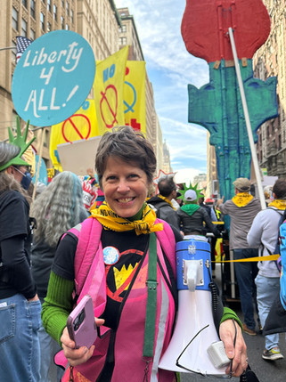 Julie Peppito (b. 1970, Tulsa, Oklahoma) is a Brooklyn-based artist and activist, celebrated for her imaginative and deeply layered mixed-media works that transform cultural detritus into striking visual narratives. Over a career spanning more than three decades, Peppito has developed a unique artistic language that blends sculpture, tapestry, collage, painting, and public art, engaging with themes of connection, environmental reconnection, memory, and the human condition. She brings these themes into her political art which recently was on the cover of The New York Times in coverage of the No Kings march in New York City.