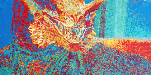"I make everything from portraits and landscapes to still life and pop art. Recently I made 2 series of dog and cat portraits where they are all in medieval costume (images attached). I made them for the Medieval Fair in Norman, but after naming them all and devising backstories, I've begun writing a novel with them. I've also recently specialized a lot more into pop art, focusing on video game characters painted in styles of Monet, Van Gogh, Bilibin, etc. I like to reimagine them in various ways. You'll see a pointillism dragon example attached, as well as an attempt to mimic a Byzantine-era icon (but featuring anamorphic cats)."